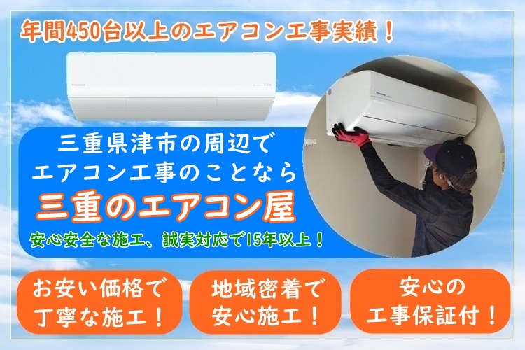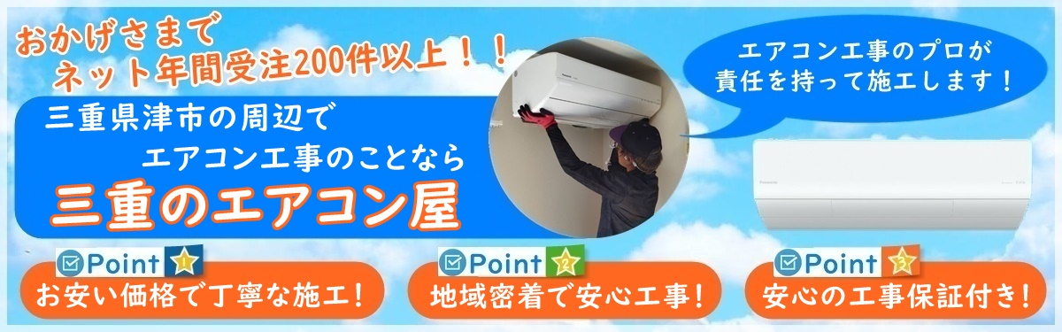 三重のエアコン屋は家庭用のエアコン工事を主にエアコン取り付け・取り外し工事をおこなっている地域密着のエアコン業者で、津市を中心に三重県で活動しております。